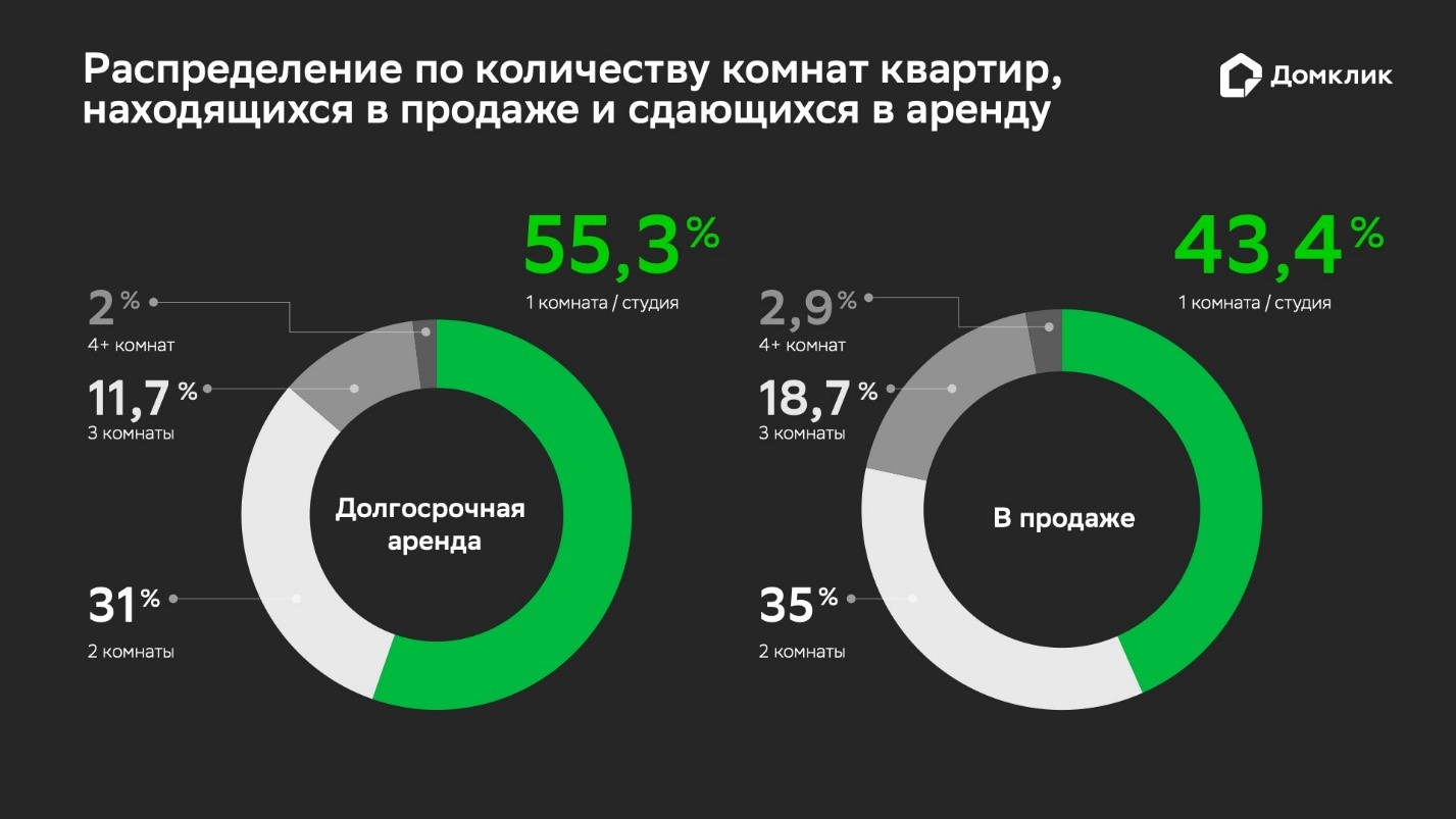 Жильё, сдающееся в долгосрочную аренду, в среднем меньше по площади, чем выставленное на продажу — аналитики Домклик